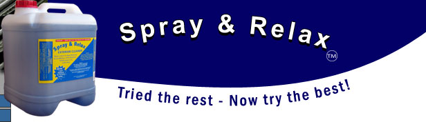 Spray & Relax works, you don't. Spray onto any exterior surface excluding polycotton tents and simply walk away - the weather will do the rest. No waterblasting or scrubbing. This product is non caustic, non bleach and non acidic.